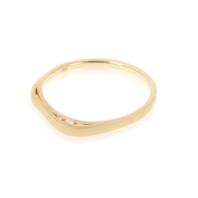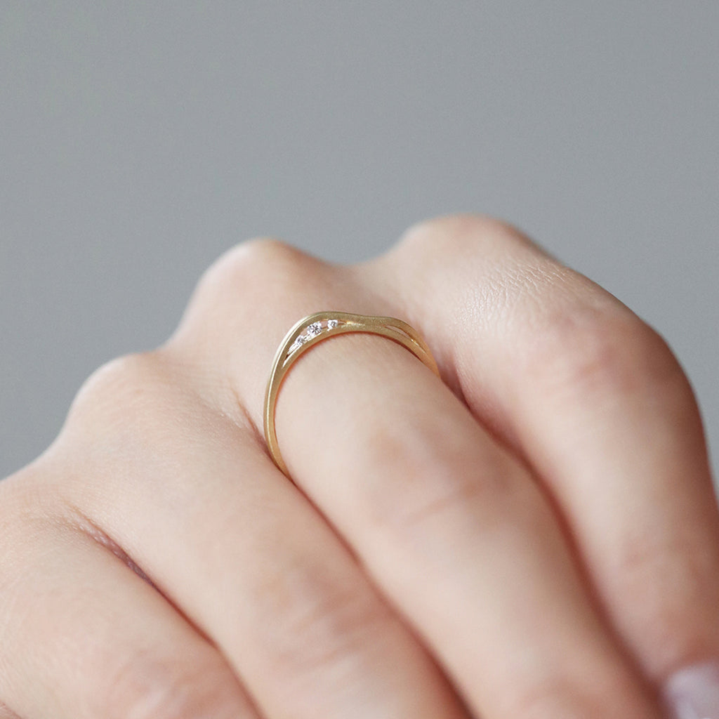 泡のオーガニックなフォルムを表現したリング。ダイヤモンドを挟み込むように留めた繊細な表情が印象的なアイテムです。人の手で一点一点選び抜かれたダイヤモンドを、丁寧にセッティングしています。リング正面は地金の優しいウェーブラインになっており、側面には3石のダイヤモンドが光り輝くミニマルな佇まいの中にも繊細な美しさが感じられるアイテムです。あえてマットな質感を施すことで、ダイヤの輝きを演出しながら、お手持ちのリングとの重ね付けも楽しめる仕様になっています。着け心地までこだわったリングは、シンプルなジュエリーこそ、上質なものをお届けしたいというPOUR TOIのこだわりがつまっています。着ける向きや角度によっても印象が変わるリングで、あなただけのコーディネートを。お持ちのチェーンに通してネックレスチャームとしても、またひとつでも、重ね付けもおすすめのアイテムです。